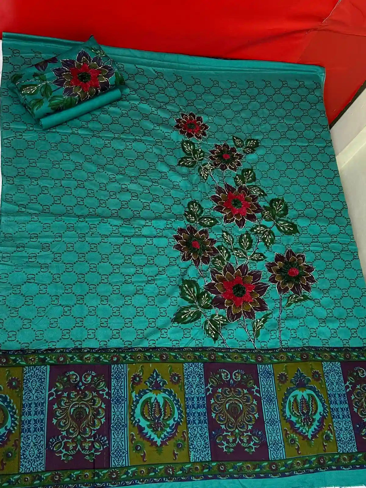 "This suit combines traditional and modern styles perfectly. The lovely velvet zarri Work will surely grab attention. It's comfortable and stylish, making it a must-have for your wardrobe!"