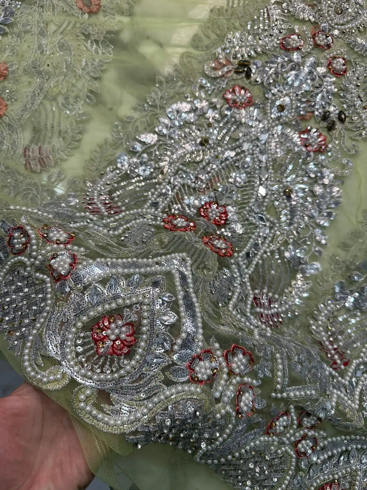 DUPATTA: Pure Net Dupatta Fully Embroidery Work Luxury Look Palu Style Pista & Silver Color Dupatta + Red Floral Applique Touch