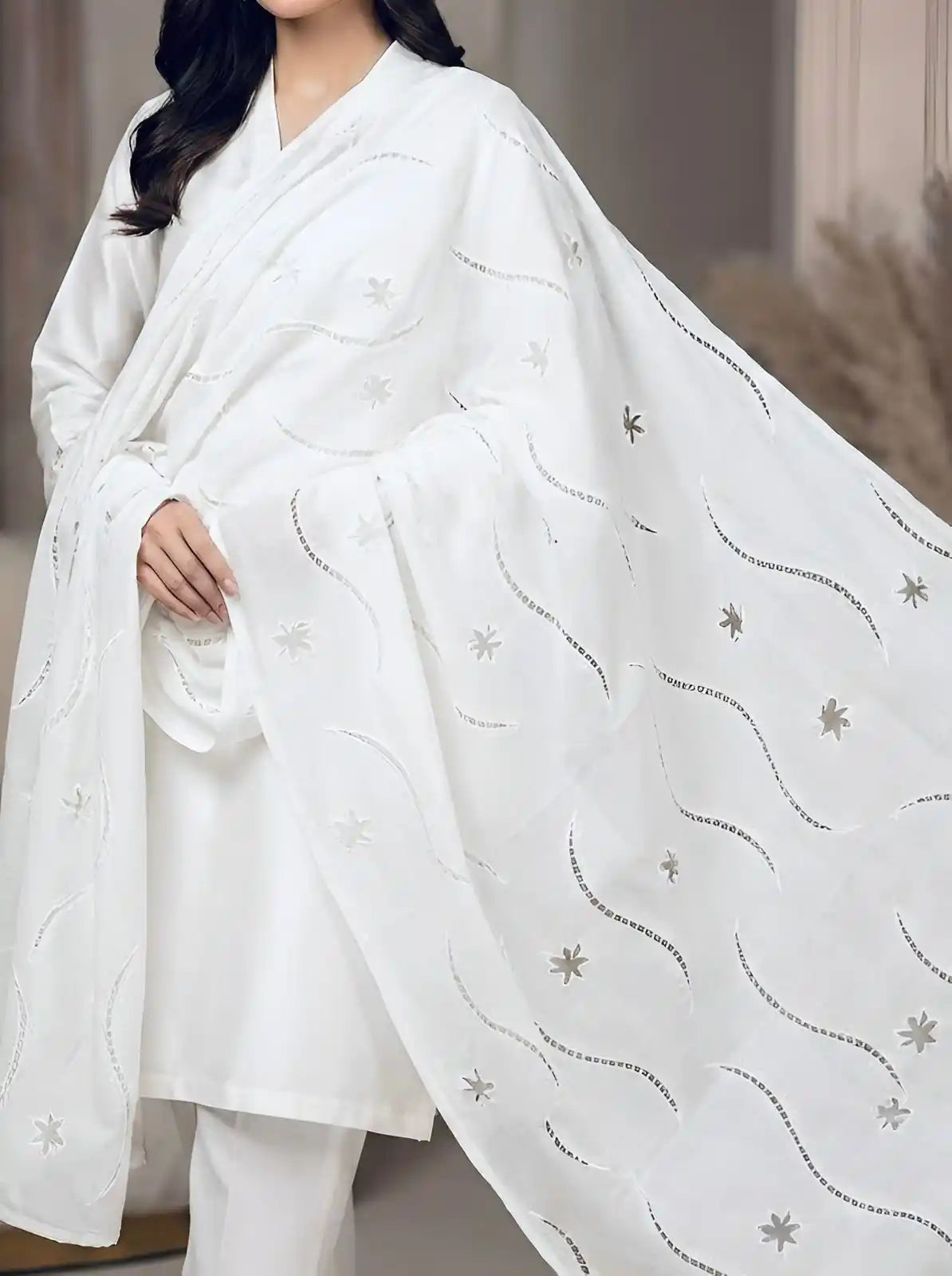 White has always been a symbol of elegance and purity. This embroidery lazer work Dupatta, in its graceful white hue, not only elevates your personality but effortlessly draws every eye around.